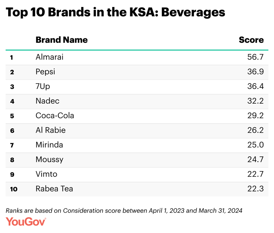 Coca- Cola (29.2), Mirinda (25.0), Moussy (24.7) and Vimto (22.7) also feature in KSA’s list of top ten beverage brands.