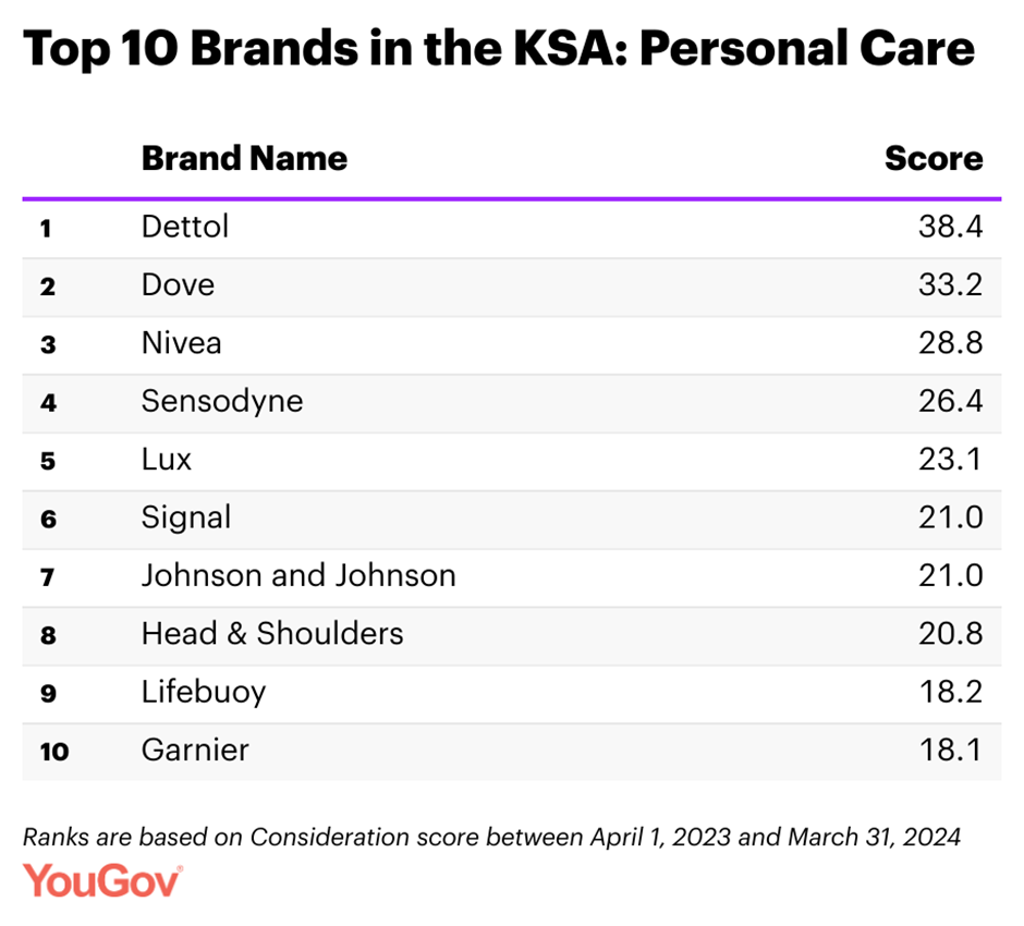 Within the Personal Care category, Dettol leads the rankings in KSA with a Consideration score of 38.4. Dove took the second place (with a score of 33.2), followed by Nivea (28.8), Sensodyne (26.4) and Lux (23.1).