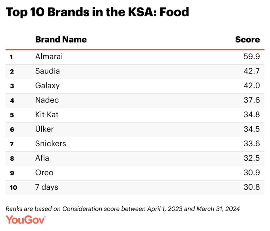 Within the ‘Food’ category, Almarai emerged as a clear winner, with a Consideration score of 59.9. The top five list is dominated by domestic brands such as Saudia in second (with a score of 42.7) and Nadec in fourth (37.6). The only exceptions are Galaxy in third (42.0) and Kit Kat in fifth (34.8).