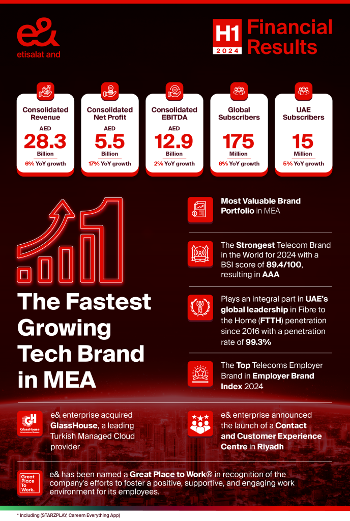 ABU DHABI: e& today announced its consolidated financial results for the first half of 2024, reporting consolidated revenues of AED 28.3 billion, a year-over-year (YoY) growth of 6 per cent, demonstrating strong performance across all business verticals.