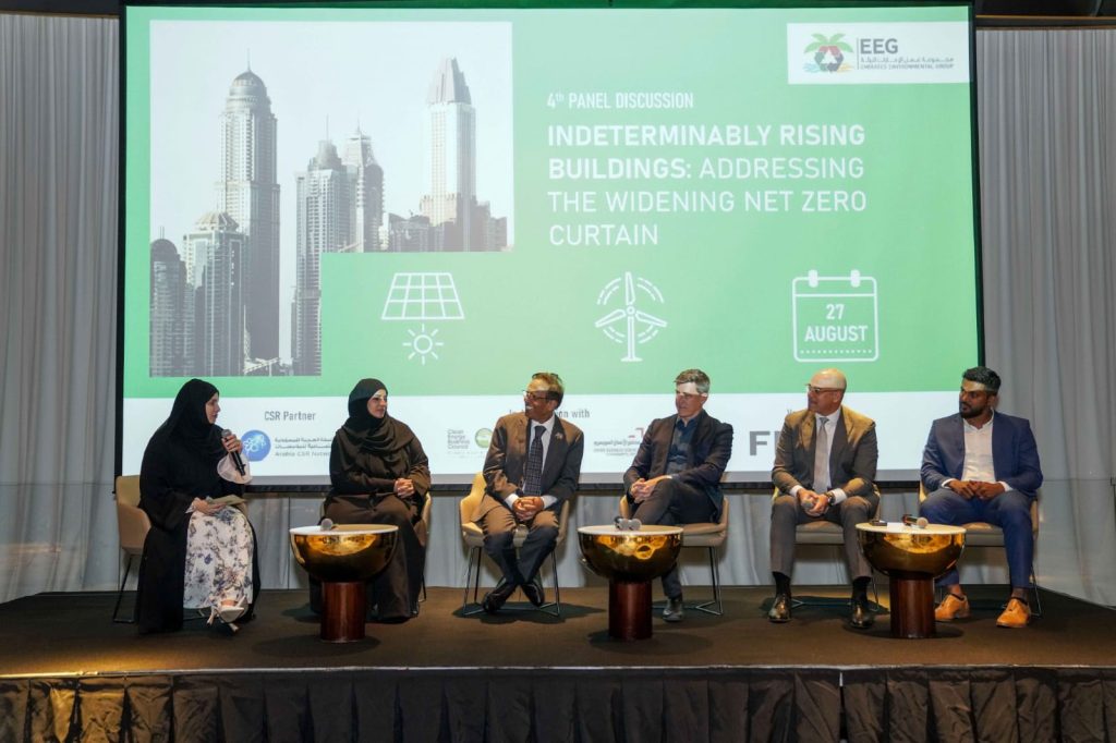 In her speech during the panel discussion, Ms. Habiba Al Mar’ashi, Co-Founder and Chairperson of the Emirates Environmental Group, said that as our urban landscapes evolve at an unprecedented pace, skyscrapers are reaching new heights, reflecting the growing ambitions of communities around the world. At the same time, governments and companies have pledged to achieve net-zero emission targets, a commitment that is gaining urgency with each passing day. As our cities grow and our skylines stretch ever higher, we find ourselves at a critical juncture, where architectural ambitions need to harmonise with environmental stewardship. The phenomenon of soaring buildings represents both a triumph of human ingenuity and a significant challenge for sustainable development.