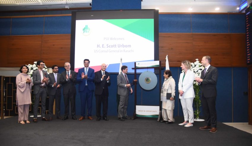 KARACHI: The Consul General of United States of America in Karachi, Mr. Scott Urbom, struck the gong at a gong ceremony held at the Pakistan Stock Exchange (PSX) to open the trading day. The Consul General and his team were earlier welcomed at the Exchange by Dr. Shamshad Akhtar, Chairperson PSX; Mr. Nadeem Naqvi, Acting CEO PSX; Board members PSX, and senior management of PSX. The guests at the ceremony also included business leaders from US based companies functioning in Pakistan.