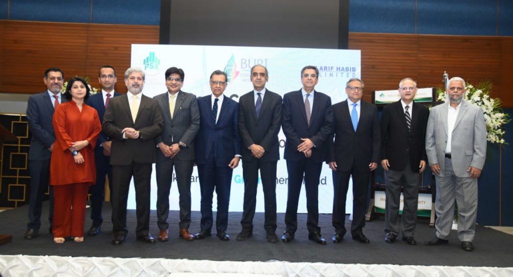 A gong ceremony was held at the Pakistan Stock Exchange (PSX) to mark the listing of Burj Clean Energy Modaraba (“Burj Modaraba”). Burj Modaraba is the first green energy fund in accordance with Shariah principles to be listed on the Stock Exchange on the Growth Enterprise Market (GEM) Board of PSX. The gong was struck by Mr. Muneer Kamal, Chairman, Burj Modaraba; Mr. Saad Zaman, Sponsor Director, Burj Modaraba; other Director(s) and top management of Burj Modaraba, amidst the presence of Mr. Shahid Ali Habib, CEO of Arif Habib Limited (Advisor to the Issue); Mr. Nadeem Naqvi, Acting CEO of Pakistan Stock Exchange, and senior management of PSX.
