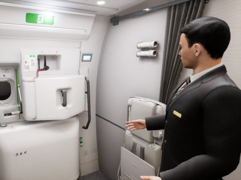 The platform features photorealistic, high-fidelity, fully modelled cabin interiors of the Airbus A380, Boeing 777 and Airbus A350 aircraft, plus emergency slides, tarmac, airbridges and different views of water and land. It will be supported with hyper-realistic audio and images. Multi-player scenarios with avatars playing the part of backup crew members will ensure standard operating procedures are accurately replicated.