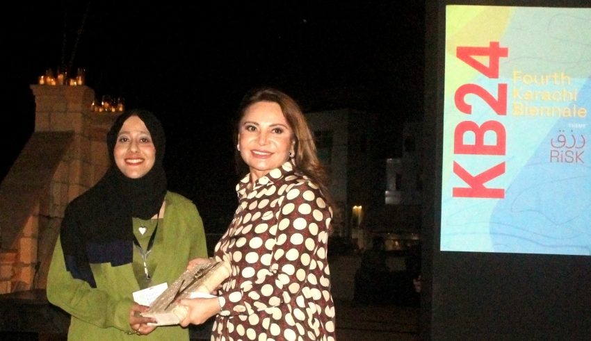 Dr. Zeelaf Munir presented the EBM Emerging Artist Award to young creative Anusha Khawajah Shahid. Anusha’s piece ‘Hawah’s Garden: Threads of Nurture’ is a testament towards the rural women of South Asia who weave together communities while often remaining invisible. The piece centers itself around the charpai, a traditional hand woven bed, and its place as the hearth, linking communities to food. The utilization of 70% sustainable and 30% biodegradable materials highlights the symbiotic relationship these women have with the land.
