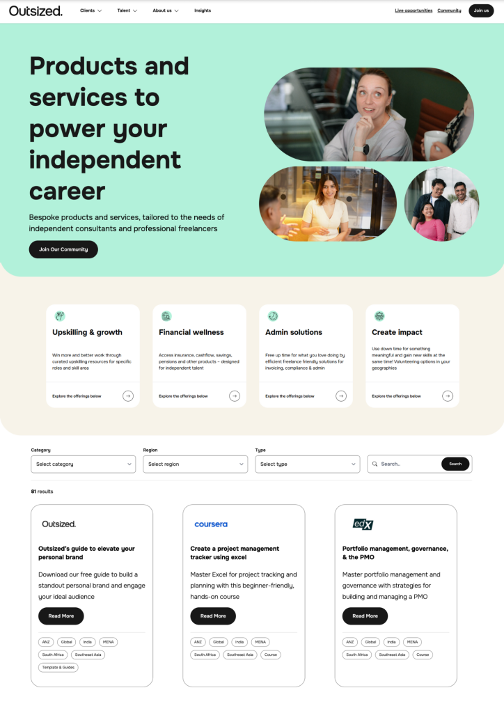 All flexible talent, regardless of whether they are part of Outsized, can access Perks recommendations. The platform continuously adapts to their evolving needs based on market trends, ensuring they have the practical, actionable tools to excel in their careers.