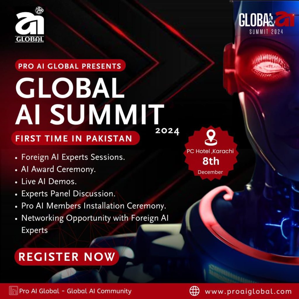 KARACHI: Pro AI Global proudly presents the Global AI Summit 2024, a groundbreaking, futuristic event poised to ignite Pakistan’s AI revolution. On December 8th, 2024, the prestigious PC Hotel, Karachi, will host this landmark gathering, ushering in a new era of innovation and collaboration.