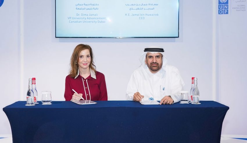 The MoU was signed by His Excellency Jamal bin Huwaireb, CEO of MBRF, and Dr. Dima Jamali, Vice President University Advancement, CUD.