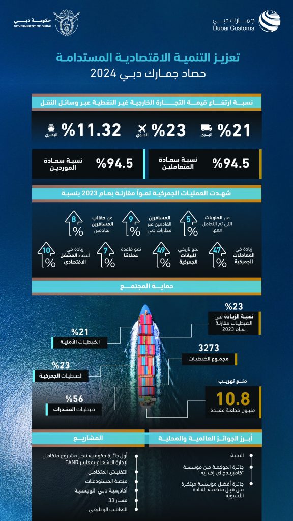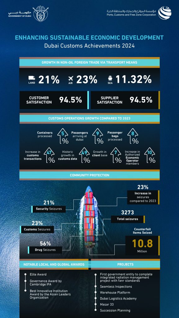 Dubai Customs saw an exceptional 49.2% growth in customs data in 2024 compared to the previous year. Its smart services have gained global recognition as a benchmark in modern customs practices. The department also made significant strides in protecting intellectual property, seizing over 10.8 million items.