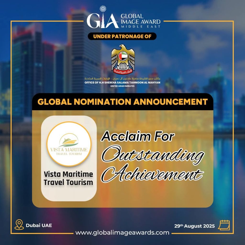 The Global Tourism Excellence Honorary Award is a testament to her dedication to advancing the tourism sector and enhancing brand visibility for Vista Maritime Travel Tourism LLC on both regional and international fronts.