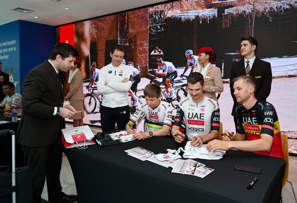 The team was led by Tadej Pogačar, world number one in the UCI World Ranking and four-time Tour de France champion. He was joined by world number 5 João Almeida, along with riders Florian Vermeersch, Jay Vine, Johnatan Narváez, and Tim Wellens. The team’s CEO, Mauro Gianetti, also attended. They were warmly welcomed by Sir Tim Clark, President, Emirates Airline.