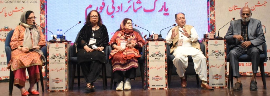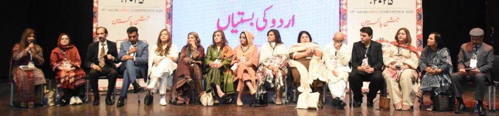 Arts Council of Pakistan Karachi, literary activities remained at their peak on the third day of the four-day 18th Aalmi Urdu Conference 2025 – Jashan-e-Pakistan. A total of 22 sessions were held, including the launch of eight books, sessions with Tehzeeb Hafi and Umair Najmi, and an Aalmi Mushaira in memory of Shaheed Benazir Bhutto. On the third day of the conference, sessions were organized on a wide range of subjects including Urdu Ghazal, Urdu Novel, Yorkshire Adbi Forum, Kitabon ki Runami ,Intizar Hussain ke So Saal, Pashtun Saqafat aur Adab, Punjabi Adab aur Saqafat, Mausmiati Tabdeeli, Pakistan ko Darpaish Buhran, “Khoon Se Jab Jala Diya…”, “Koi To Phool Khilaye” Hamara Taleemi Mayaar, Mausiki ka Safar aur Badalte Rujhanat, Japan mein Urdu, Yaad-e-Raftgaan, Urdu ki Bastiyan, Kashmir ka Muzahmati Adab, “Bazeecha-e-Atfal Hai Duniya Mere Aage” (Jashan Salgirah), Film ka Safar, and “Mitti Mein Chiragh Rakh Diya Hai”, Jaun aur Main. Aalmi Mushaira in memory of Shaheed Benazir Bhutto.