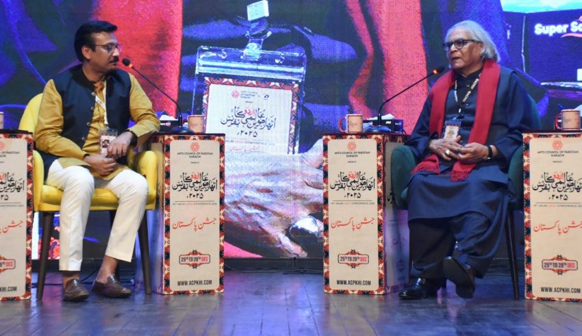 In the session “Musiki ka Safar aur badalta Rohjanay”, renowned musicians and singers Arshad Mahmood, Tina Sani, Shareef Awan, Salman Alvi, and Azhar Hussain shared their views on different aspects of music, while Amjad Shah performed the duties of moderator. Participants expressed regret that Pakistani artists do not receive the appreciation they deserve at the local level. Shareef Awan cited examples of Nusrat Fateh Ali Khan and Ustad Nisar Bazmi, stating that the tradition of acknowledging artists’ contributions has weakened, forcing many talented individuals to leave the country. Salman Alvi highlighted the role of television, saying that in the past films succeeded mainly due to music, and television introduced singers like Alamgir, Muhammad Ali Shehki, and Sajjad Ali to the masses. Tina Sani recalled the early creative environment where senior artists and young singers worked under one roof, enabling direct learning. Azhar Hussain said that the arrival of Nisar Bazmi and Nashad transformed musical styles and connected Pakistani music with global standards. Arshad Mahmood said that tradition is not static but evolves through gatherings and creative forums, and that music is not merely entertainment but a source of social and intellectual awareness.