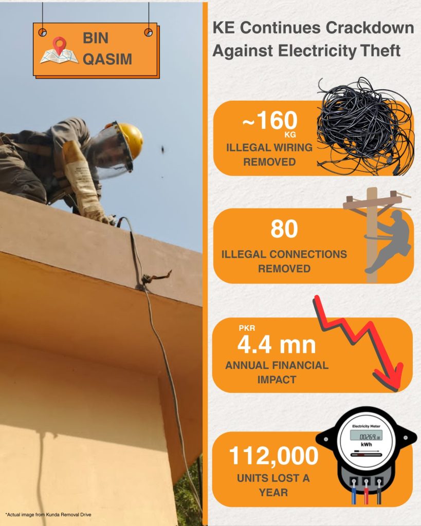 KARACHI: In order to reduce distribution loss, K-Electric (KE) continued its operation against electricity theft, removing 80 illegal electricity connections weighing nearly 160kg from unmetered commercial shops and hotels connected to a PMT in Karachi’s Rind Goth, Bin Qasim Town.