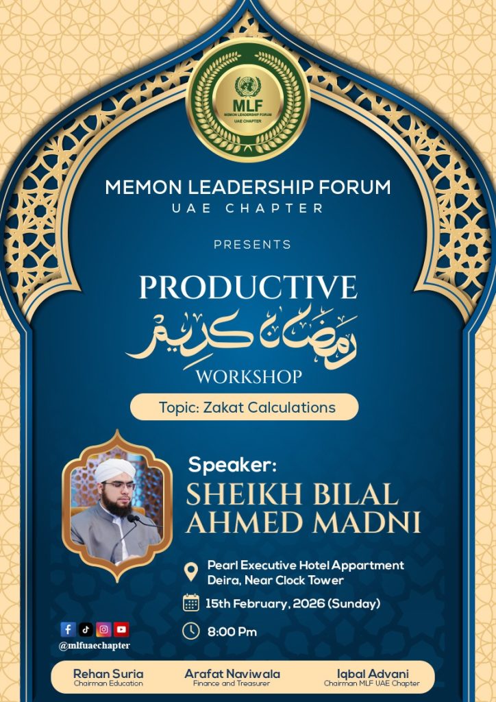 DUBAI: The Memon Leadership Forum (MLF) UAE Chapter, under the visionary leadership of Mr. Iqbal Advani, Chairman UAE Chapter, is set to organize a Productive Ramadan Kareem Workshop on Zakat Calculation on Sunday, 15 February 2026, at the Pearl Executive Hotel, Dubai, UAE. The initiative aims to prepare individuals and families to observe Ramadan with greater understanding, responsibility, and spiritual awareness, focusing on the correct calculation and obligation of Zakat.