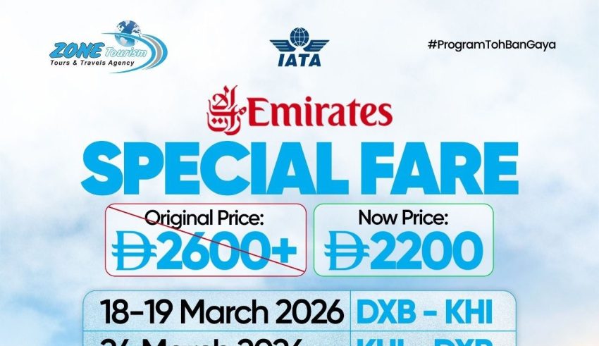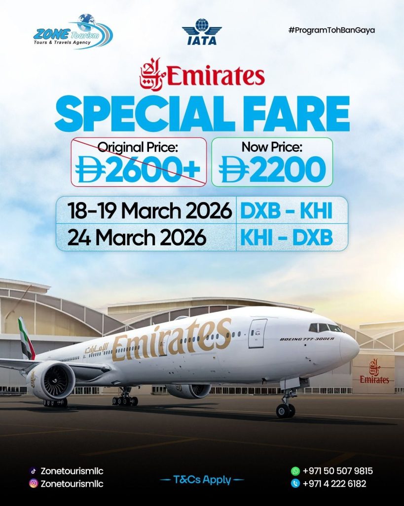 According to Muhammad Hammad, the special fares are available for flights from Dubai to Karachi on 18 and 19 March, and from Karachi to Dubai on 24 March. He emphasized that seats are limited and encouraged travelers to secure their bookings early to avoid disappointment. Passengers can contact Zone Tourism for reservations and further details via WhatsApp at +971 52 709 3004 or by calling +971 4 222 6182. The company reiterated its commitment to providing reliable travel services and memorable holiday experiences for customers during Eid.