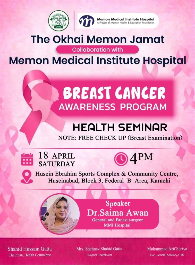 KARACHI: Okhai Memon Jamat (OMJ) in collaboration with Memon Medical Institute Hospital (MMIH) is organizing an important Breast Cancer Awareness Program on Saturday, 18th April, 2026 at 4:00 PM at the Husein Ebrahim Sports Complex & Community Centre, Hussainabad, Block 3, F.B Area, Karachi, aimed at promoting early detection and preventive healthcare among women of the community.